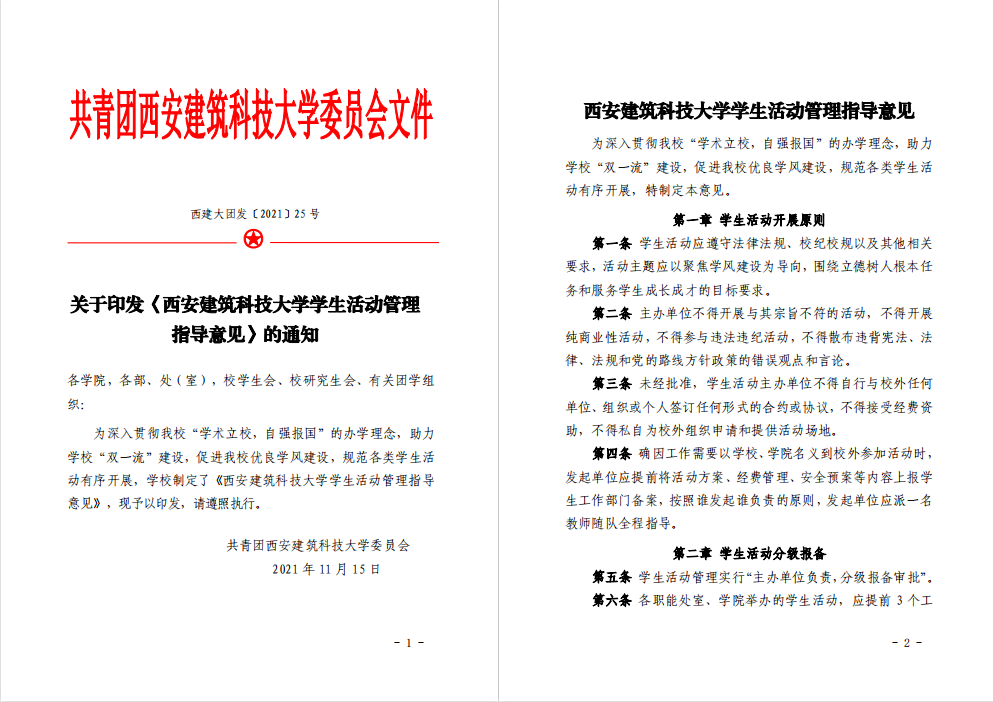 为切实加强和改进大学生思想政治教育,保障我院学生课外活动健康、有序地开展,加强我院学生活动安全管理,规范学生活动秩序。2021年12月5日,我院两校区全体学生干部以新一届学生干部座谈学习会为契机,于南山书院201组织学习了《关于印发《raybet在线官网学生活动管理指导意见》的通知(西建大团发[2021]25号)》文件内容。