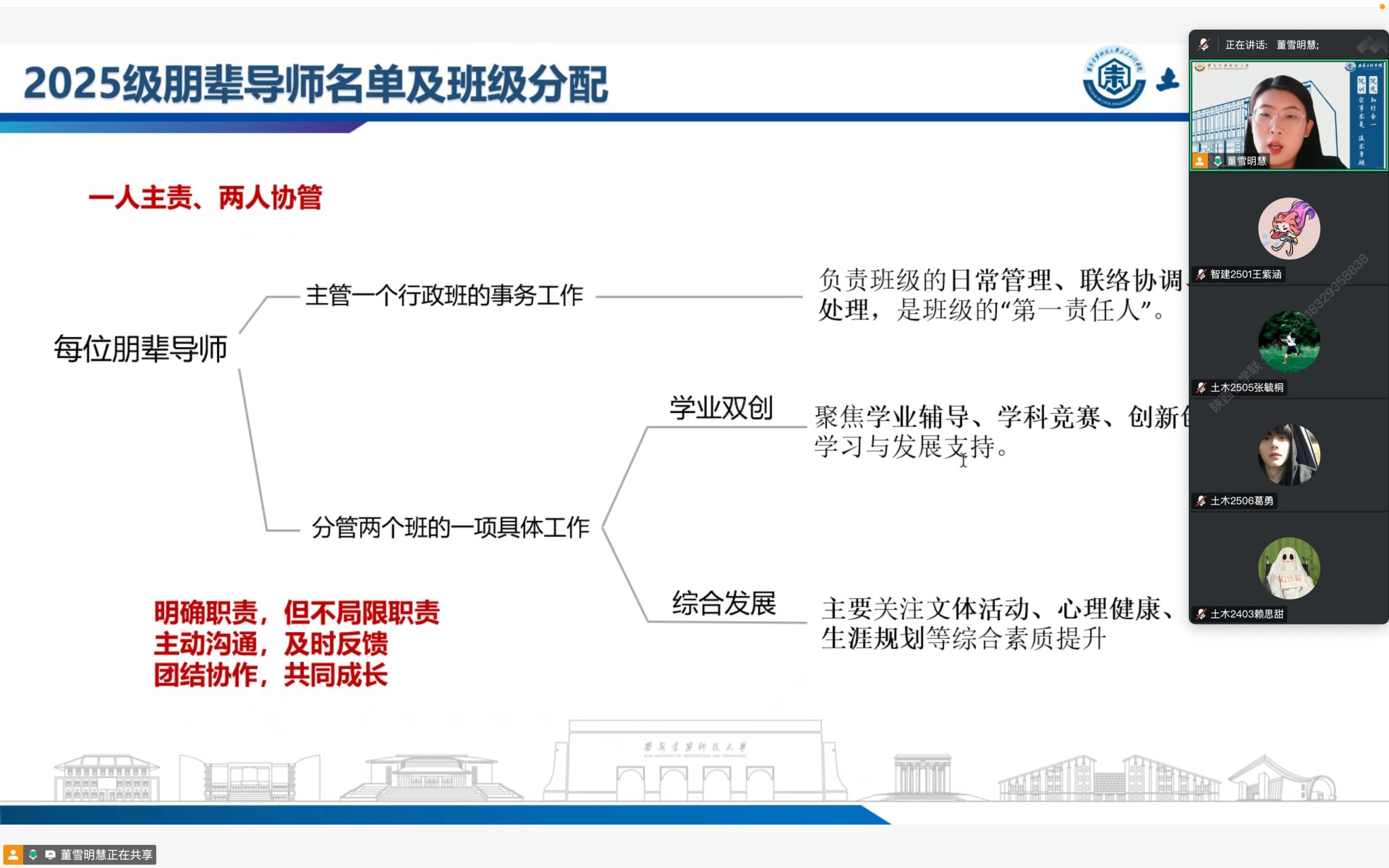 会上,董雪明慧公布了2025级朋辈导师班级分配及职能分工,强调工作纪律,明确工作职责,就重点任务,工作规范等进行了针对性指导。