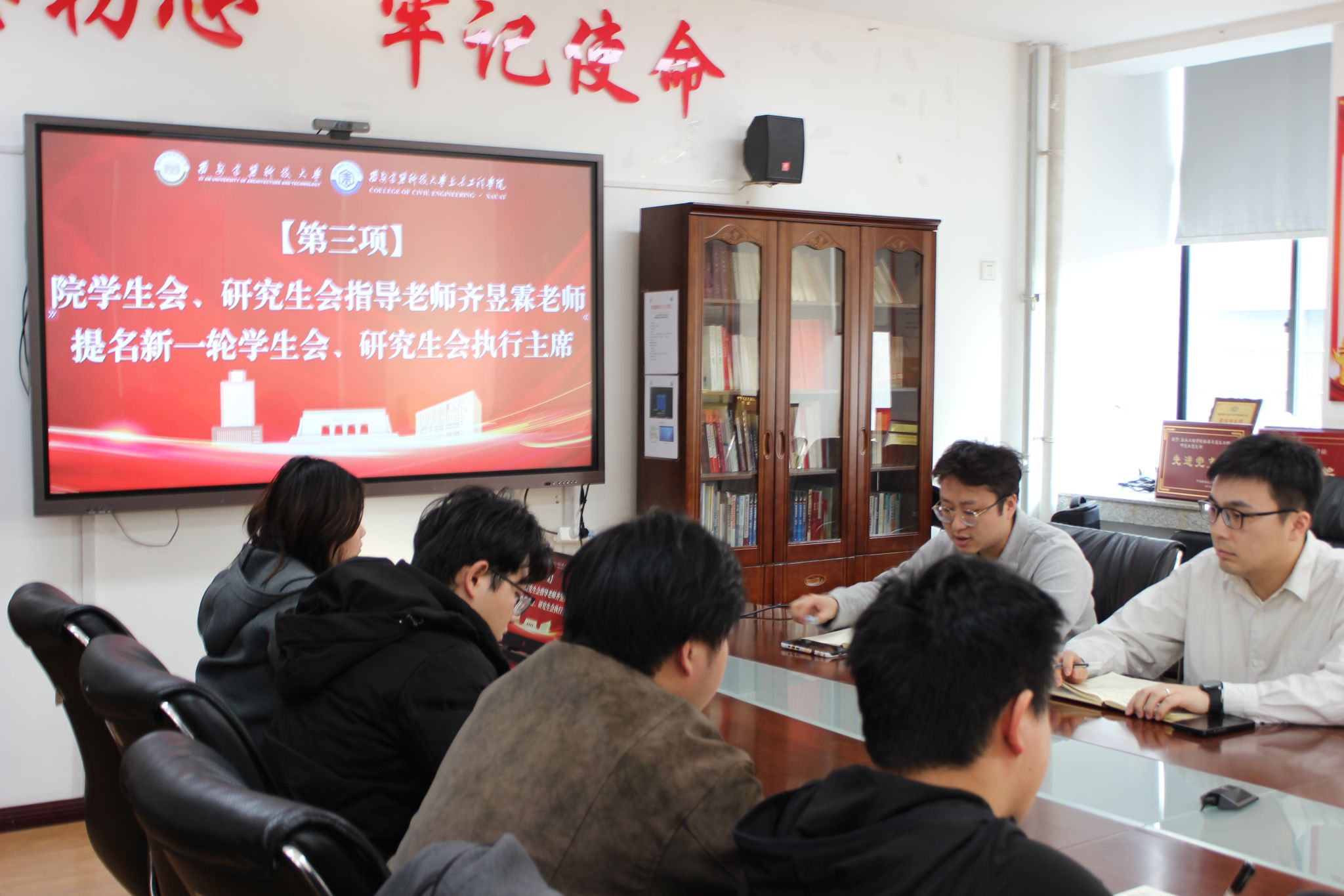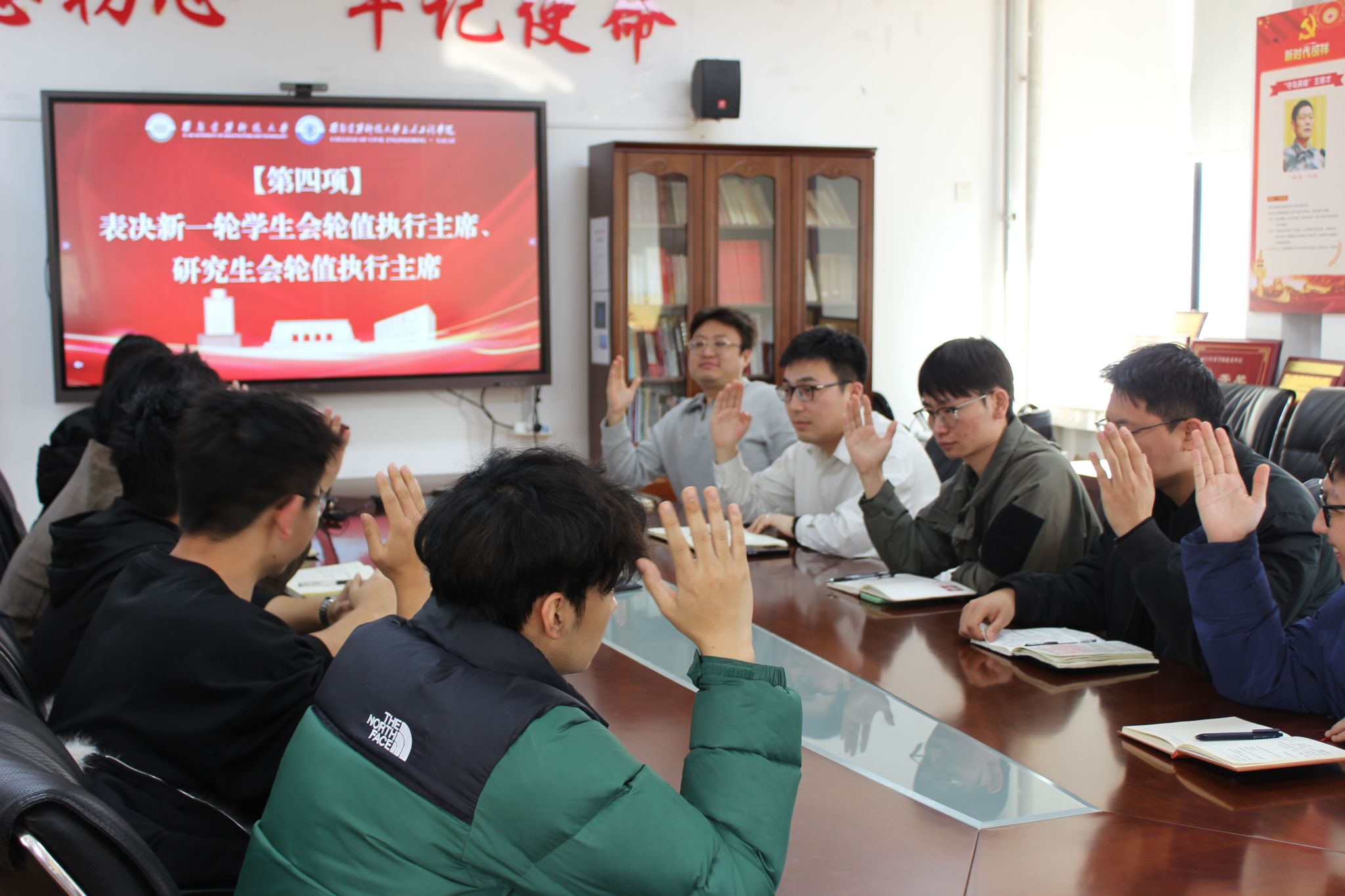 根据《关于巩固高校学生会(研究生会)改革成果的若干措施》等文件要求,学院学生会、研究生会指导老师齐昱霖宣读新一轮学生会、研究生会执行主席名单,全体委员一致表决通过叶尚杰同学、黄宇翔同学分别担任自会后起算为期两个月的执行主席。