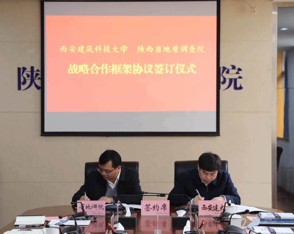 地质环境处处长左文乾对地调院的基本情况做了简要介绍,着重介绍了地调院与建大业务交叠的版块;全体人员通过观看宣传短片对建大进一步深入了解。双方代表雷鹏副校长和黄建军副院长进行了签约。