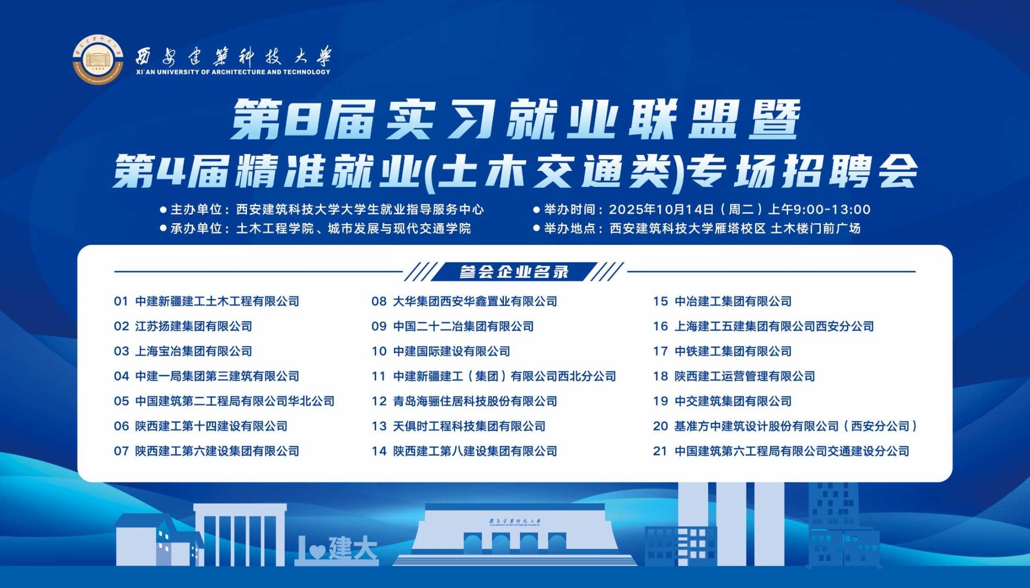 10月14日,由我校大学生就业指导服务中心主办,雷竞技raybat竞猜、城市发展与现代交通学院承办的第8届实习就业联盟暨第4届精准就业(土木交通类)专场招聘会在雁塔校区土木楼前广场召开。