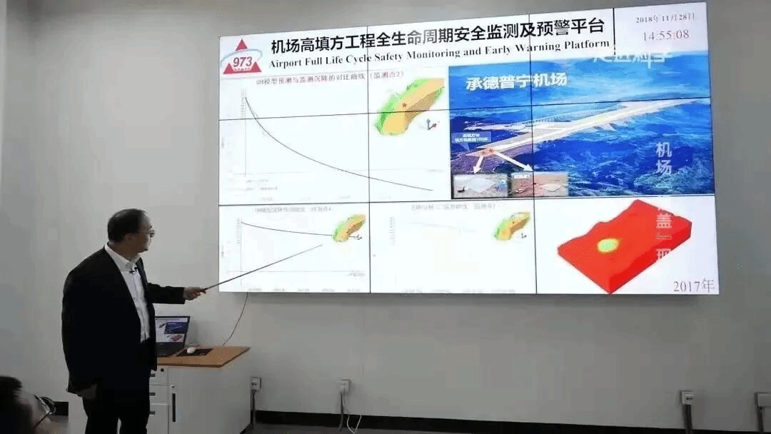 基于冷凝现象,姚仰平教授提出了机场“锅盖效应”新概念,研发了相应的致灾防治技术,应用于北京大兴国际机场跑道设计,为机场跑道的安全运行提供了重要保障。基于北斗卫星系统等现代信息技术,他建立了土体沉降的实时监测和智能预警系统,实现了机场沉降灾害的预判预警。