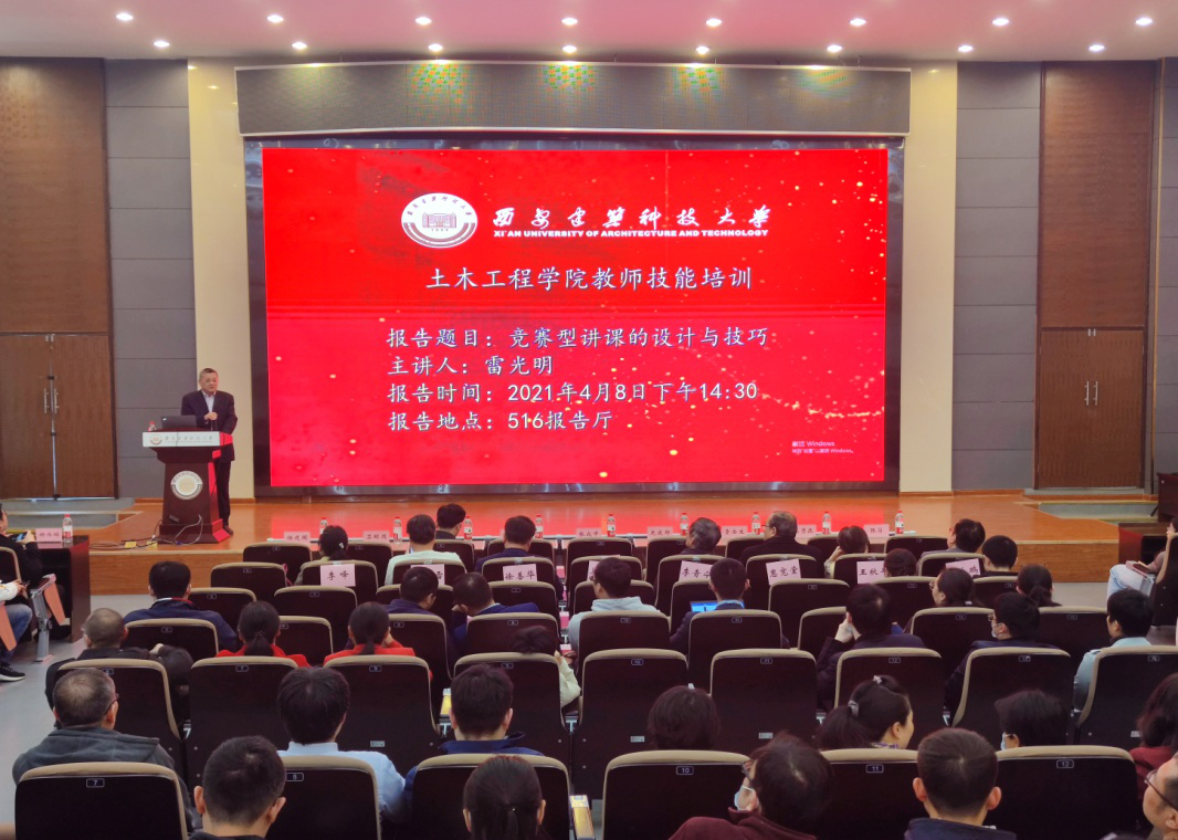 为不断提高学院本科教学质量与教学管理水平,进一步加强教师队伍建设,促进青年教师间的相互学习与交流,4月8日下午雷竞技raybat竞猜邀请陕西省教学名师雷光明教授在土木楼516会议室做了题为“竞赛型讲课的设计与技巧”的报告,学院部分班子成员以及全体专任教师参加了会议,会议由学院院长史庆轩主持。