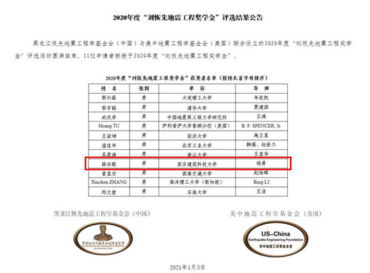 近日,2020年度“刘恢先地震工程奖学金”获奖名单揭晓,我院青年教师薛亦聪荣获这一奖项。