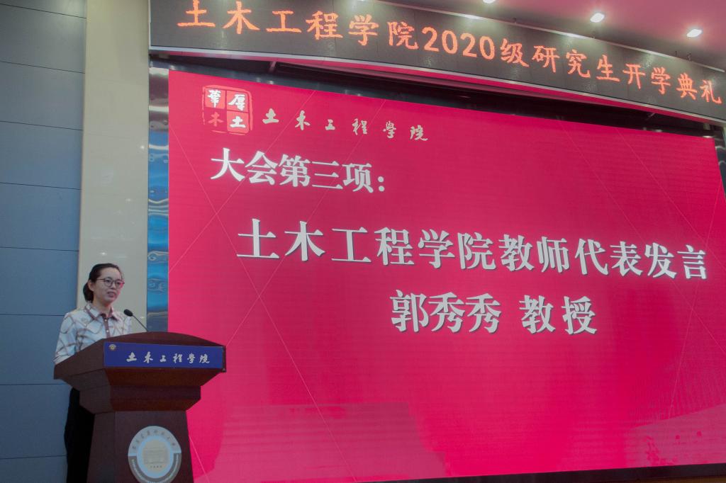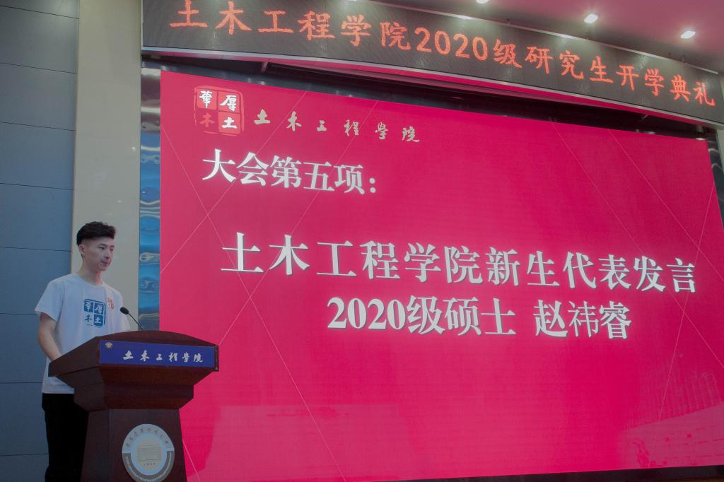 典礼在庄严的国歌中开始,院长史庆轩教授向来自全国各地的59名博士研究生及370名硕士研究生表示热烈的欢迎。史院长与同学们共同回顾了学院六十余年的光辉历程,讲述了学院近年来在学科建设、人才培养、师资力量、科学研究等方面取得的斐然成就。勉励同学们充分利用学院科研条件潜心修学,继承和发扬“土木精神”。史院长对全体2020级研究生提出了五点希望:一是要胸怀宽广,学以报国,树立崇高的学术理想;二是要上下求索,学以求真,磨练坚韧的学术品格;三是要胸怀格局,学以致用,培养敏锐的创新能力;四是要严谨诚信,恪守治学,坚守学术道德底线;五是要心态阳光,学以修身,汲取强大的心灵能量。