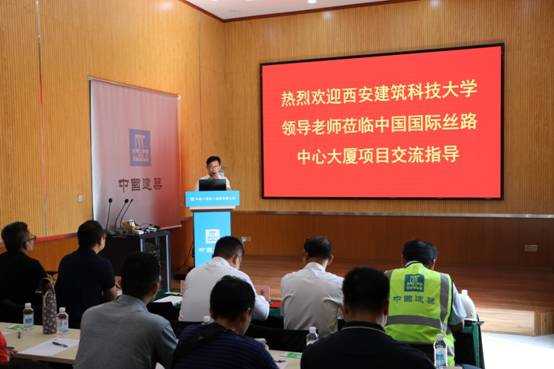 见面会上,中建八局一公司副总经理、中国国际丝路中心大厦项目经理张业致欢迎词对我院教师的到来表示热烈欢迎。随后,总工李玉龙博士对目前在建的中国思路中心大厦项目施工工艺及工程进度进行了详细介绍。