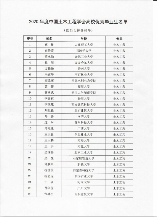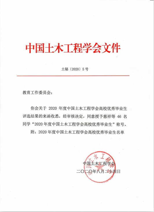 该奖项评选由学会教育工作委员会组织开展,经全国土木工程专业(包括工程管理专业)院校推荐,评审委员会评审,学会秘书处审核,决定授予46名同学2020年中国土木工程学会高校优秀毕业生称号。