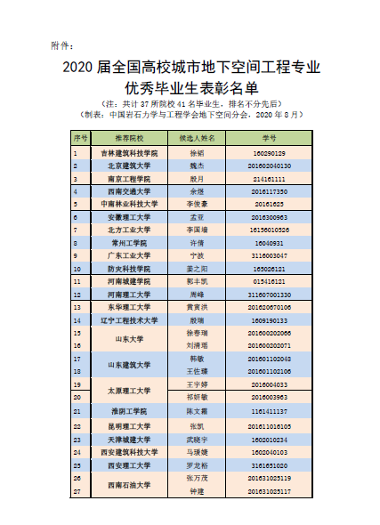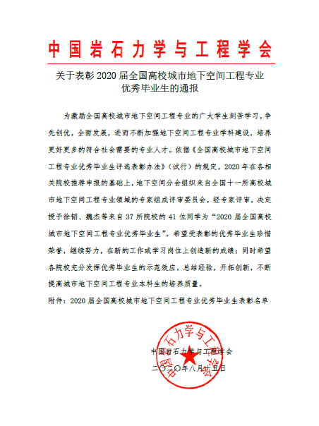 为激励全国高校城市地下空间工程专业的广大学生刻苦学习,争先创优,全面发展,进而不断加强地下空间工程专业学科建设,培养更好、更多的符合社会需要的专业人才,中国岩石力学与工程学会地下空间分会组织来自全国十一所高校城市地下空间工程专业领域的专家组成评审委员会评选“2020届全国高校城市地下空间工程专业优秀毕业生”。