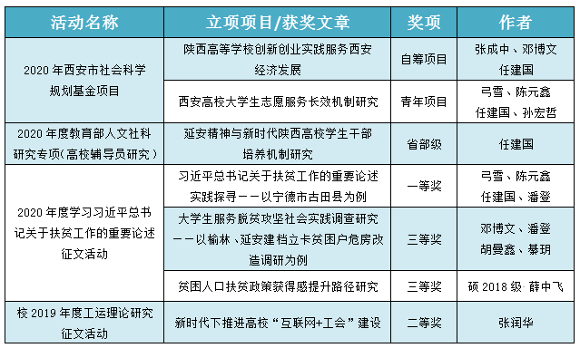 在2020年西安市社会科学规划基金项目评审中,我院张成中老师主持的《陕西高等学校创新创业实践服务西安经济发展》和弓雪老师主持的《西安高校大学生志愿服务长效机制研究》项目获得立项。