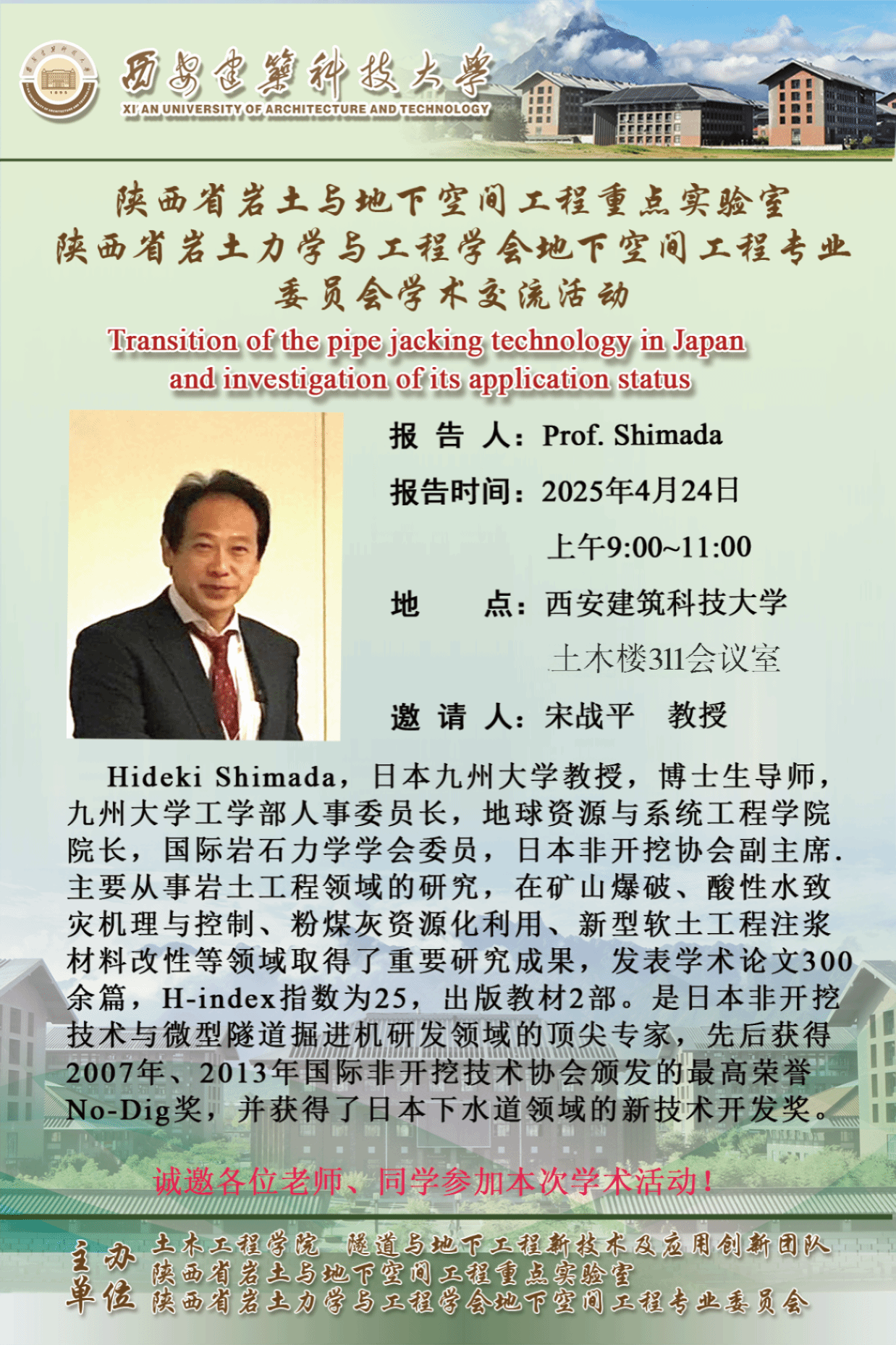 Hideki Shimada,日本九州大学教授,博士生导师,九州大学工学部人事委员长,地球资源与系统工程学院院长,国际岩石力学学会委员,日本非开挖协会副主席主要从事岩土工程领域的研究,在矿山爆破、酸性水致灾机理与控制、粉煤灰资源化利用、新型软土工程注浆材料改性等领域取得了重要研究成果,发表学术论文300余篇,H-index指数为25,出版教材2部。是日本非开挖技术与微型隧道掘进机研发领域的顶尖专家,先后获得2007年、2013年国际非开挖技术协会颁发的最高荣誉No-Dig奖,并获得了日本下水道领域的新技术开发奖。